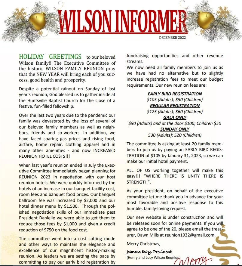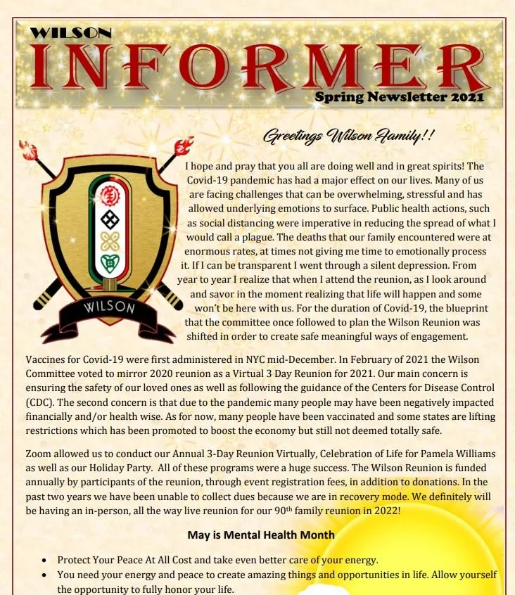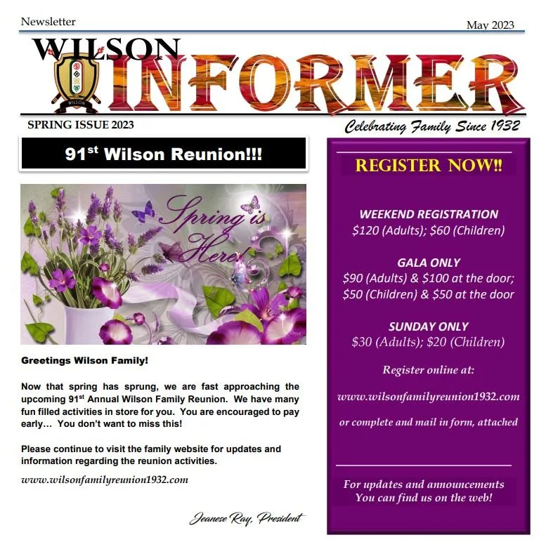 Stay connected and in the know with the Wilson Informer Family Newsletter! This is your go-to spot for the latest family updates, event highlights, and special announcements. From reunion planning news to milestone celebrations, we’re bringing all the family stories right to your screen.